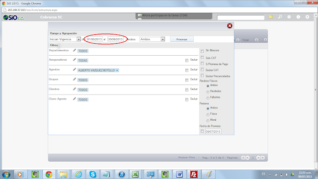 3) En la ventana que te abre escoges el rango de fechas de los recibos pendientes de pago que buscas (y puedes ponerle más opciones que vienen ahí):