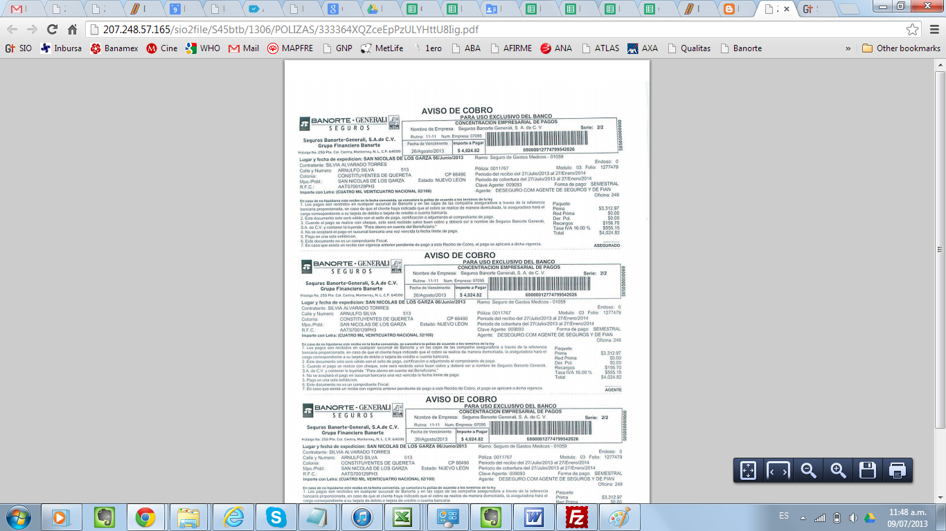 4) Te va a desplegar entonces la lista de pólizas que tienen recibos pendientes de pago en los rangos de fecha que escogiste. En ese listado buscas la póliza de tu cliente, le das click y te abrirá una ventana, y en la opción de «Adjuntos» te aparecerán los recibos adjuntos: