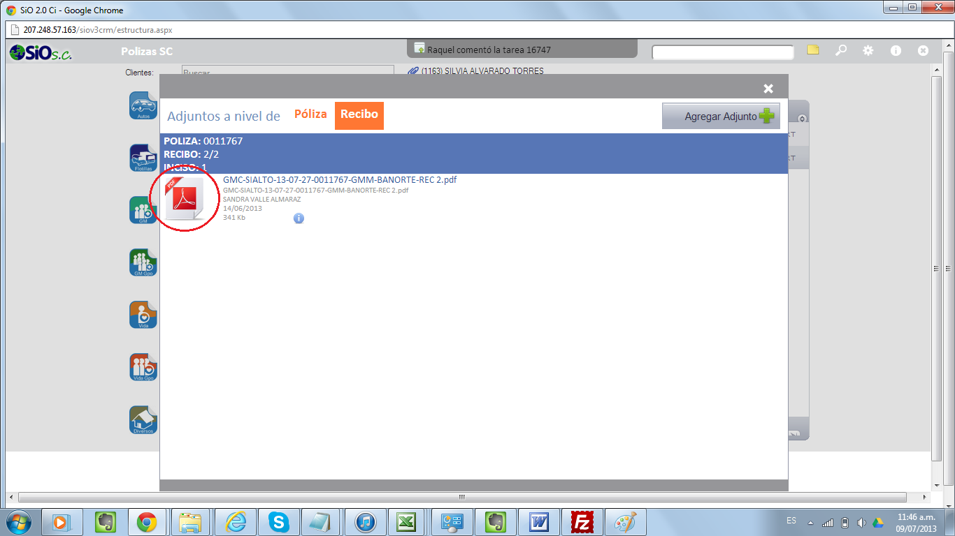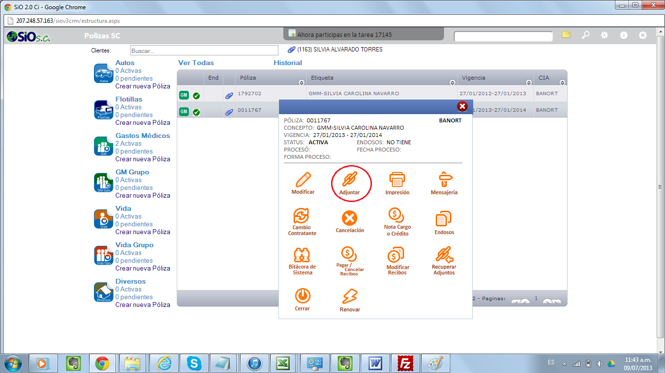 3) Le das click sobre la póliza del cliente que buscas y te abrirá una ventana en donde escoges «Adjuntar»: